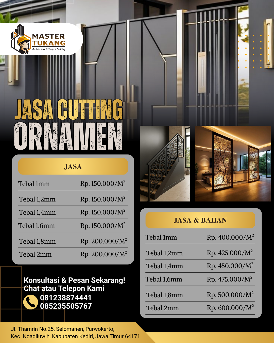 Master Tukang adalah perusahaan konstruksi berbadan hukum dengan legalitas resmi terdaftar di KEMENKUMHAM Sebagai CV. ANUGERAH MITRA KONSTRUKSI, spesialis laser cutting dan kontraktor umum profesional.